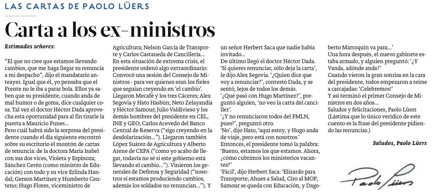 Pero cuál habrá sido la sorpresa del presidente cuando el día siguiente encontró sobre su escritorio el montón de cartas de renuncia: de la doctora María Isabel con sus dos vices, Violeta y Espinoza; Sánchez Cerén (como ministro de Educación) con todo y su vice Erlinda Handal; Gerson Martínez y Humberto Centeno; Hugo Flores, viceministro de Agricultura; Nelson García de Transporte y Carlos Castaneda de Cancillería...