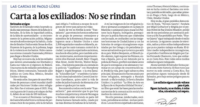 Recomiendo a todos a ver la serie “Transatlantic”, para entender que lo que hoy muchos compatriotas y otros de Nicaragua o Venezuela están viviendo es parte del drama humano llamado exilio, creado por las más diversas dictaduras de la historia.
